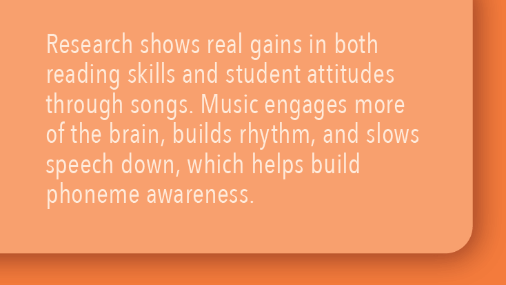 Research shows real gains in both reading skills and student attitudes through songs. Music engages more of the brain, builds rhythm, and slows speech down, which helps build phoneme awareness.
